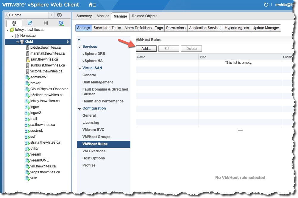 I mention in my vSphere Best Practices that you should have an anti – affinity rule to keep your domain controllers on different hosts. That way if there is a host outage, the odds of losing both or more, of your domain controllers is reduced. This info could be used for other kinds of servers too. So lets enable this!