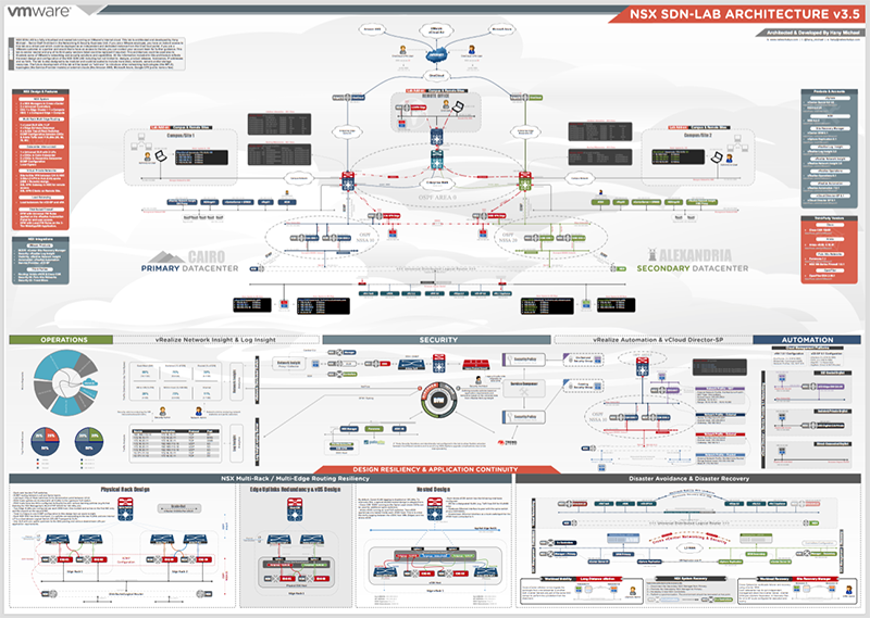 As a VMworld 2016 special, I would like to announce publicly the new NSX SDN-LAB (formerly NSX vLAB) release v3.5. There have been multiple internal releases of this lab on OneCloud but this one represents the latest and greatest from NSX. I have also developed a brand new architecture for the lab to show a holistic and detailed views of all the components together in a whopping A0 scale diagram — this is literally the largest diagram I have ever architected on Visio.