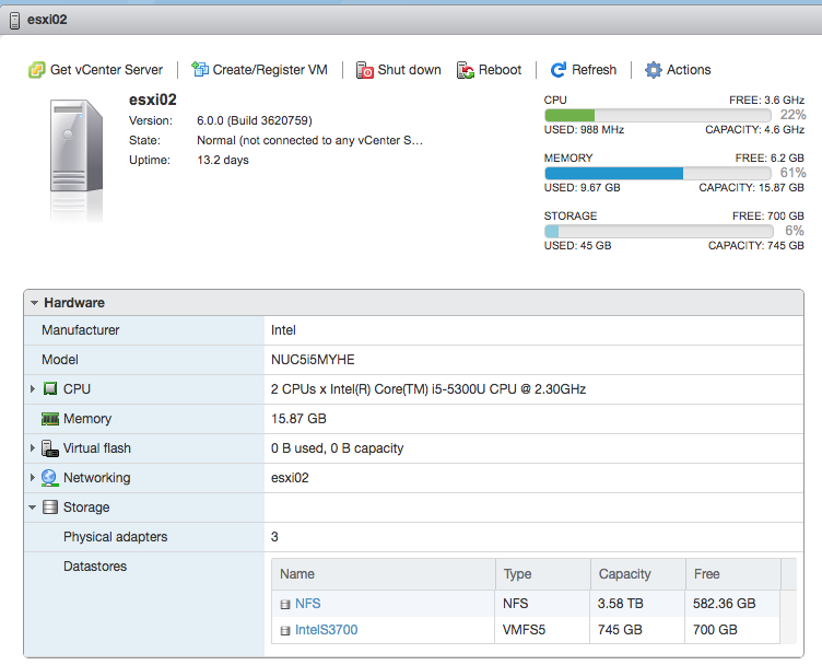 Last year I blogged about my home lab and it has been running stable for more than a year. I never found the need to upgrade from vSphere 5.5 since everything just worked. My old configuration was:2x Intel NUC5i5MYHE with i5-5300U processor and Intel VPRO/AMT technology16 GB DDR3L Kingston MemoryKingston E50 240GB SSD32GB Sandisk Cruzer fit USB KeySynology NAS used as shared NFS datastoreESXi 5.5 and vCenter 5.5 I wanted to get my home lab upgraded to 6.0 update 2 to stay current but at the…Read More