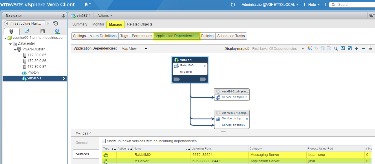A request that I continue to receive from customers on a fairly regular basis is a way to extract the virtual machine application services and dependencies that is provided by vSphere Infrastructure Navigator (VIN) solution. Below is an example of what a VIN discovery might look like and in this case, it is actually mapping out the application and dependencies of itself.