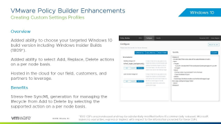 The VMware Policy Builder is a quick and easy way of building Windows 10 custom settings profiles leveraging device description framework (DDF) definitions automatically. This tool is hosted in the cloud at https://vmwarepolicybuilder.com for our field, customers, and partners to leverage. You can use this tool to create custom settings profiles for CSPs (profiles) in the Workspace ONE UEM console. Please provide your feedback using the feedback link on the site and include as many details as possible. Now supporting multiple Windows 10 versions including Windows Insider Builds, ability to choose an action per node (Add, Delete, Replace, etc), ability to generate GUIDs, and supports new ADMX CSPs. VMware End-User Computing (EUC)…Read More