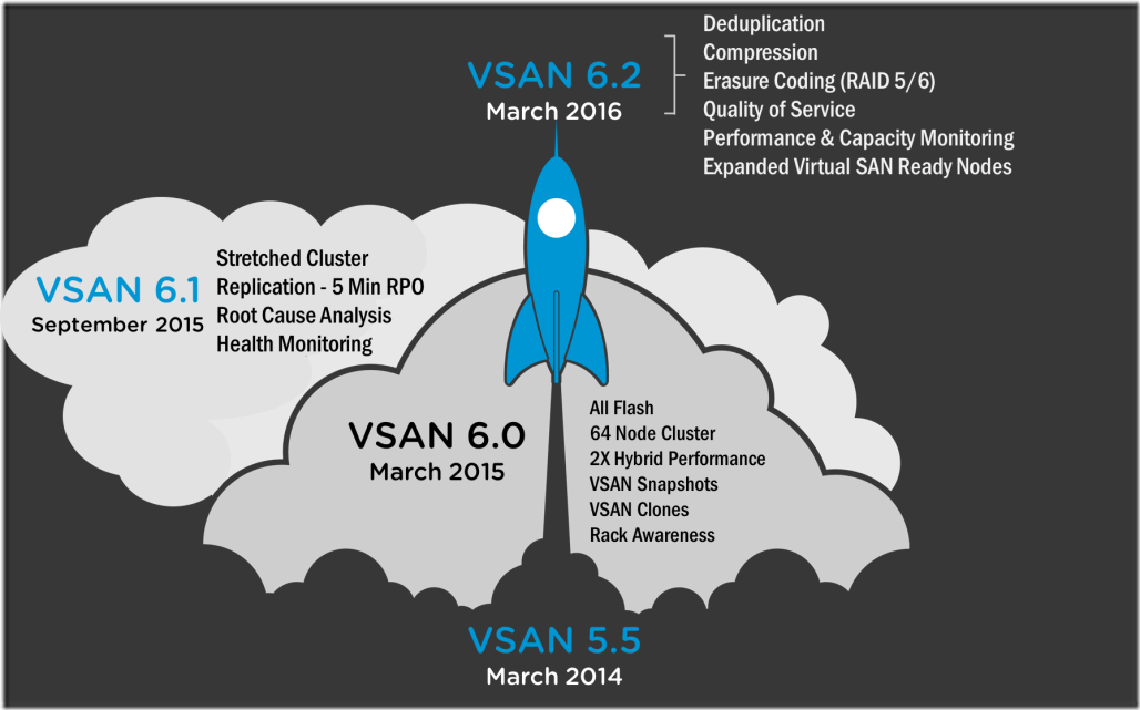 Virtual SAN is a VMware storage solution that is tightly integrated with vSphere—making storage setup and maintenance in a vSphere virtualized environment fast and flexible. Virtual SAN 6.2 adds several features and improvements, including additional data integrity with software checksum, space efficiency features of RAID-5 and RAID-6, deduplication and compression, and an in-memory client read cache.
